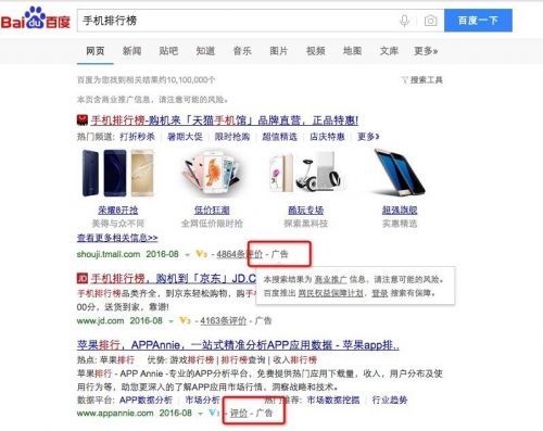 作為受影響最大的百度搜索,TechWeb查詢發(fā)現(xiàn),目前百度的搜索結(jié)果頁(yè)面的廣告樣式已經(jīng)由原來(lái)的“商業(yè)推廣”變成“廣告”二字描述了。